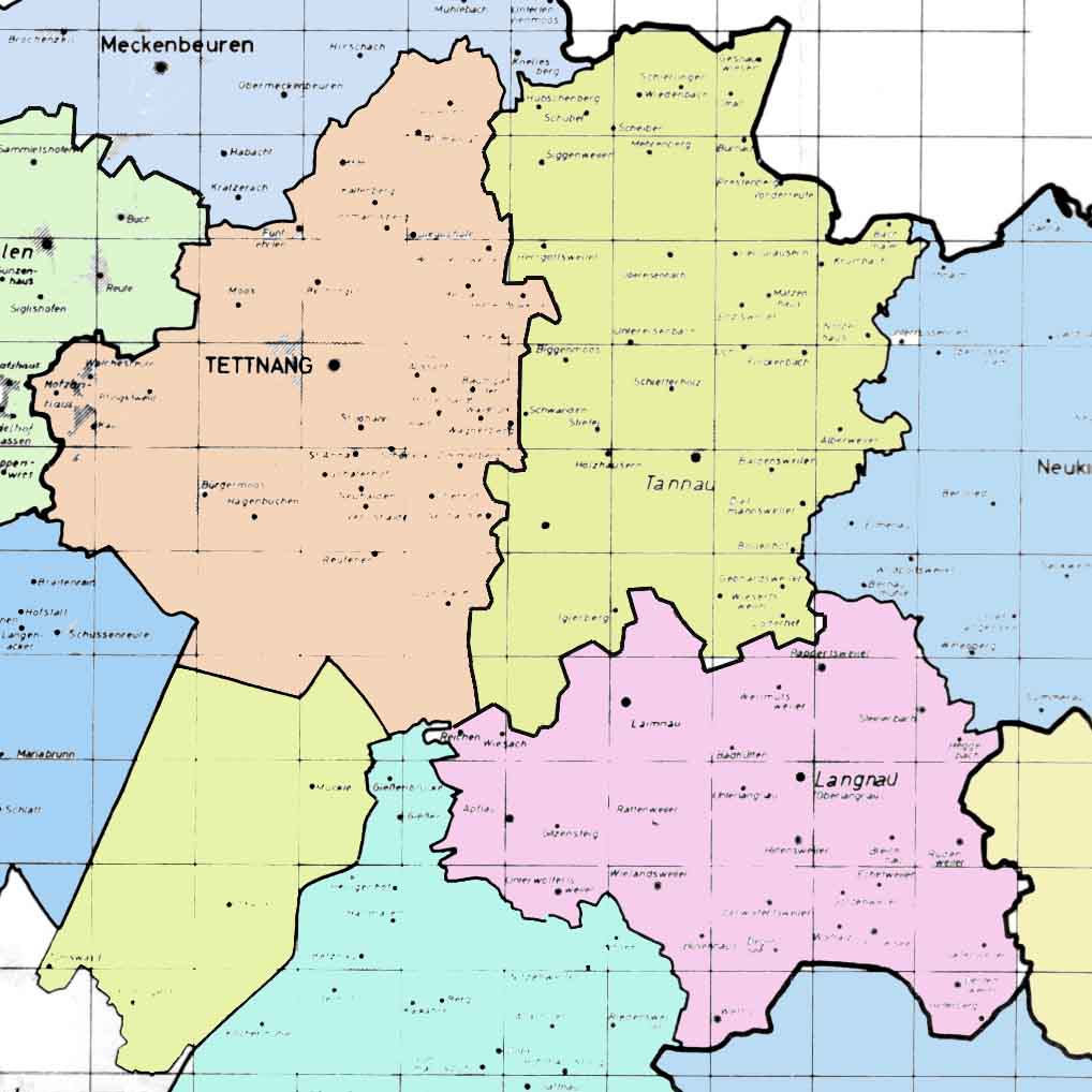 Bei der umfassenden Neugliederung des Oberamtes Tettnang wird die Gemeinde Obereisenbach aufgelöst und dem Gebiet von Tettnang und Tannau zugeteilt. Die aufgelöste Gemeinde Laimnau und Teile der aufgelösten Gemeinde Flunau kommen zu Langnau.
