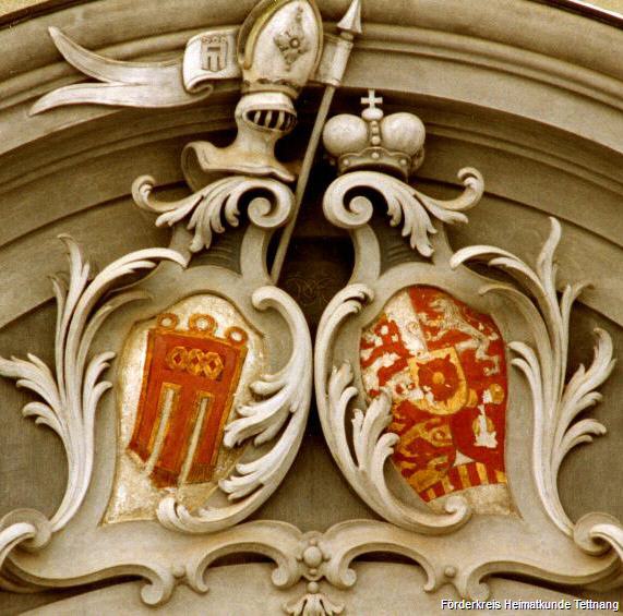 - Abb. 6: Allianzwappen Montfort / Limburg-Styrum über dem Hauptportal des Neuen Schlosses in Tettnang